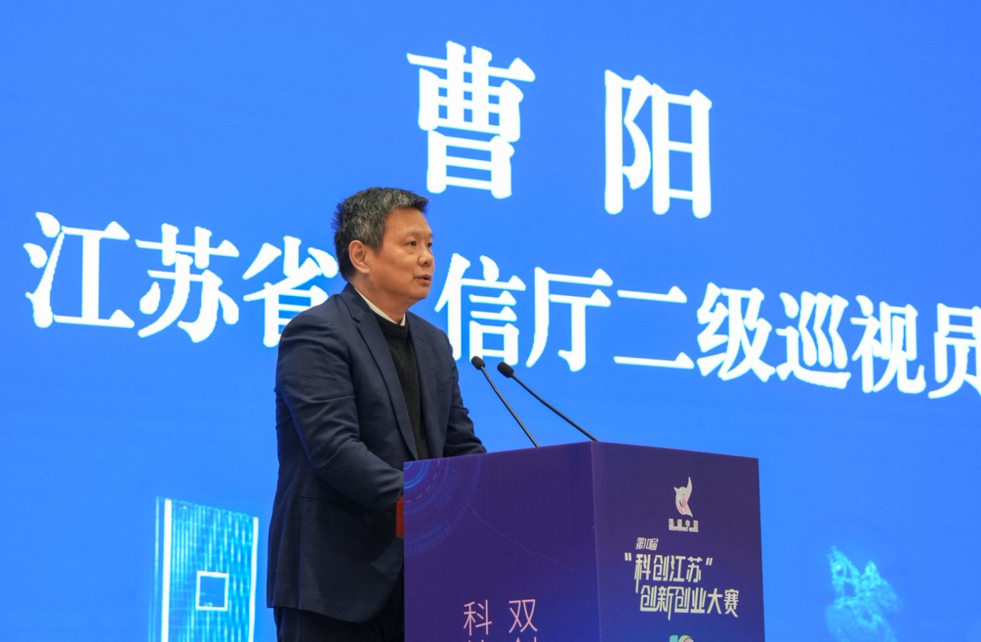 江蘇省工信廳二級巡視員曹陽在大賽頒獎典禮上講話。他希望借助“科創江蘇”這一平臺,進一步促進省內外優秀信息技術創新資源與宿遷深厚的產業基礎和應用場景深度對接,加速創新成果落地轉化,推動產業鏈、創新鏈、資金鏈、人才鏈深度融合,形成技術驅動應用,市場牽動創新的良好創業氛圍,助力宿遷數字經濟實現更高質量發展。